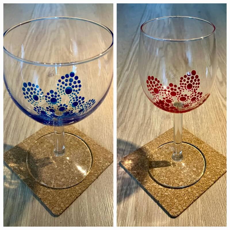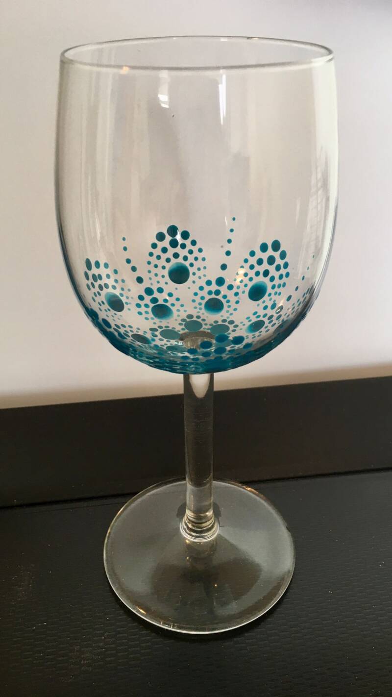 Zoals u ziet is het ook mogelijk om op serviesgoed en glas te dotten. Hiervoor wordt speciale verf gebruikt, die na in de oven te zijn geweest zelfs in de vaatwasser kan.